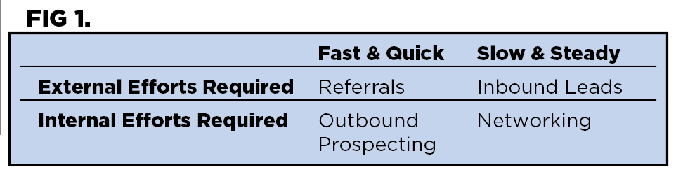 A best practice is to have multiple lead generation channels and test their results to determine where you’re getting the best return on investment. All lead generation channels can be categorized into four quadrants. (Fig. 1.)
