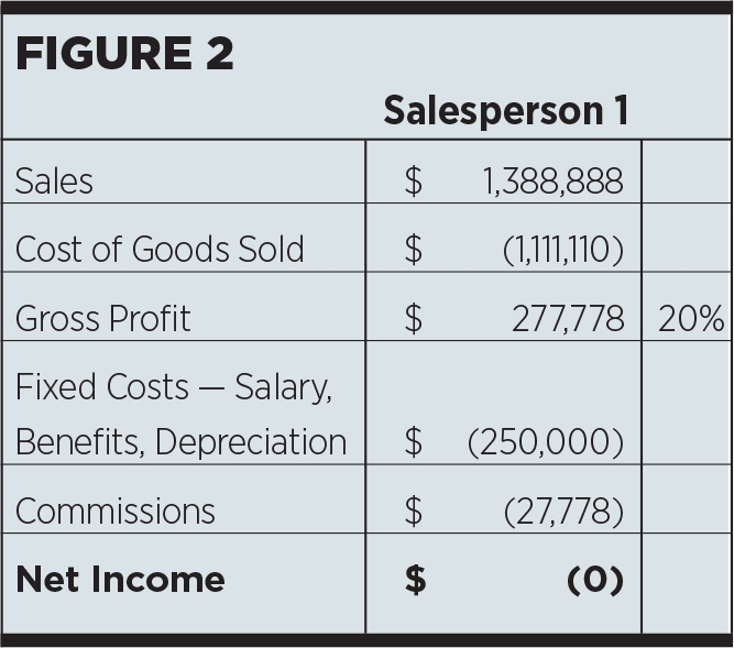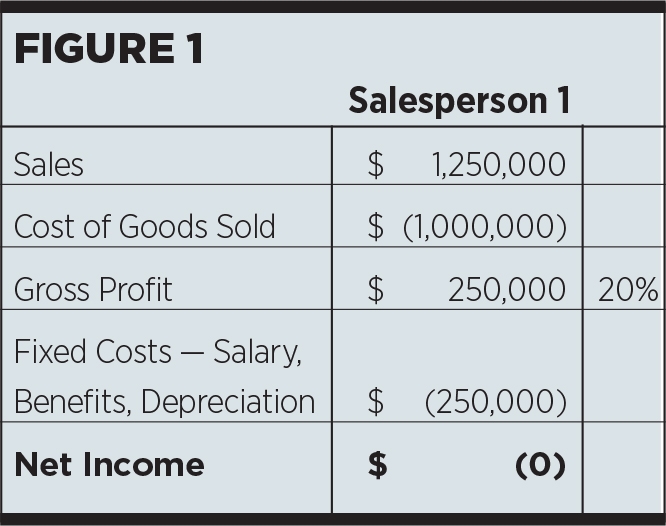 Say, for example, your total fixed costs for a particular salesperson are $250,000. Let’s also assume that the typical gross profit margin on sales is 20 percent. This means that the salesperson will have to generate $1,250,000 in sales before the company will break even on its investment. This is the reality before even considering commission or other variable costs. This calculation alone can assist you in setting commission structures. You will understand the level of sales required to achieve “break-even,” and therefore set the commissions to pay out only after the salesperson achieves break even.